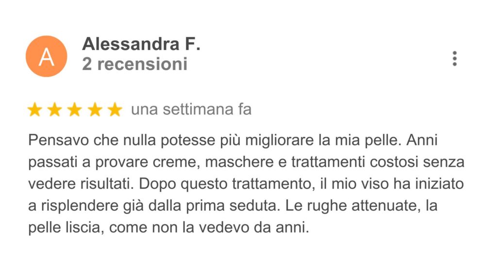 "Non mi aspettavo un risultato così immediato! Dopo un solo trattamento, la mia pelle è apparsa più liscia, compatta e distesa. Le rughe si sono attenuate e il viso ha ritrovato luminosità. È incredibile vedere la differenza allo specchio in così poco tempo!"